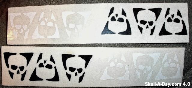 “Lastly are some stickers I designed & printed back when I was a silk screen printer. They are about an inch tall on clear vinyl like a mini, instant stencil graffiti. I would stick them in random places that I felt needed its ‘skull awareness’ heightened. I found these in a box of old stuff recently and was delighted to see them again.”